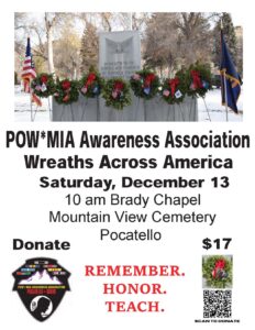 The Pocatello Civil Air Patrol and POW*MIA Awareness Association have mapped out several sections, both east and west at Mountain View Cemetery; and marked veteran graves. There are several sections available at both Pocatello cemeteries. If you or your business would like to sponsor wreaths, please contact us. Our goal is to ensure veterans graves have a wreath placed on their headstone on December 13th, National Wreaths Across America day. Grave specific requests are welcome and appreciated. Wreaths are $17.00 each and can be purchased through our local Pocatello Civil Air Patrol or by making a donation to the POW*MIA Awareness Association at www.powmiarodeo.org/donate. Please donate by November 26, 2025.